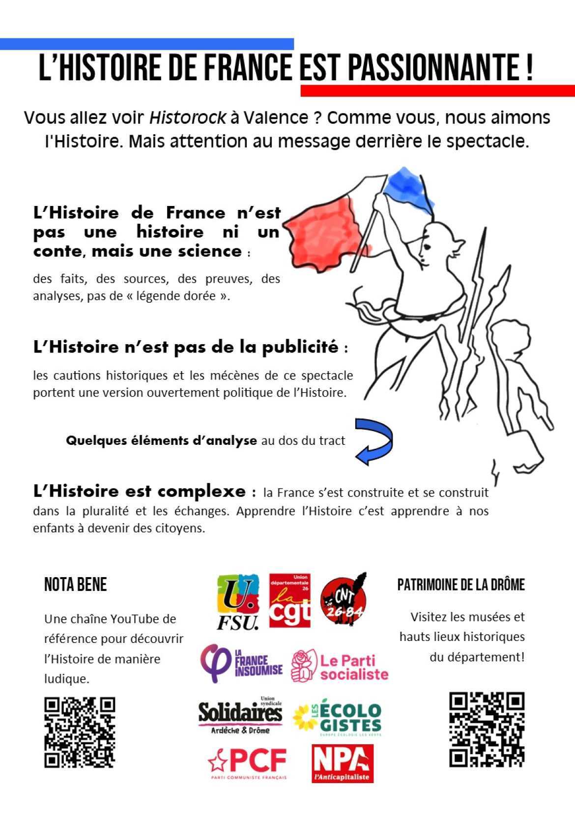 Afin de ne pas laisser l'extrême-droite dérouler son "récit" et de donner quelques clefs permettant de différencier manipulation historique et véritable travail d'Histoire, nous tracterons dans les rues de Valence ce jeudi.
