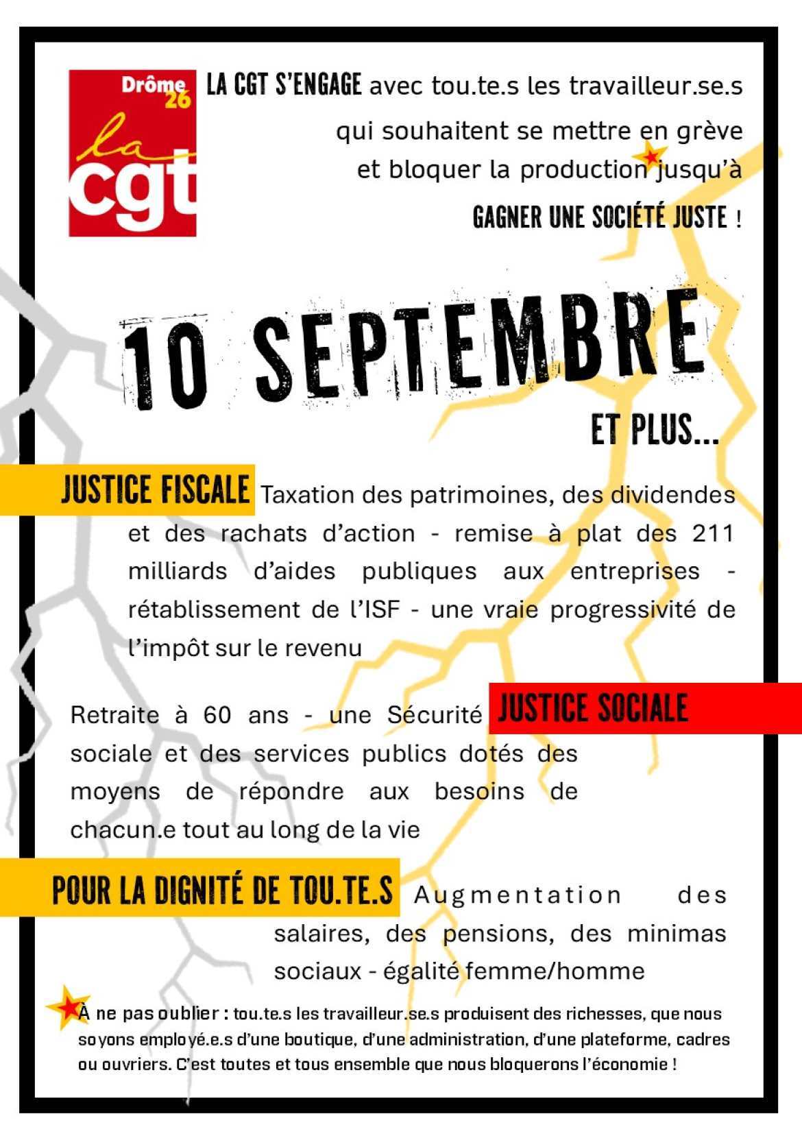 Les nombreuses mobilisations démontrent l’ampleur du mécontentement. La CGT souhaite que le mercredi 10 septembre soit une première étape réussie. La CGT appelle à construire la grève et les débrayages partout où c’est possible.