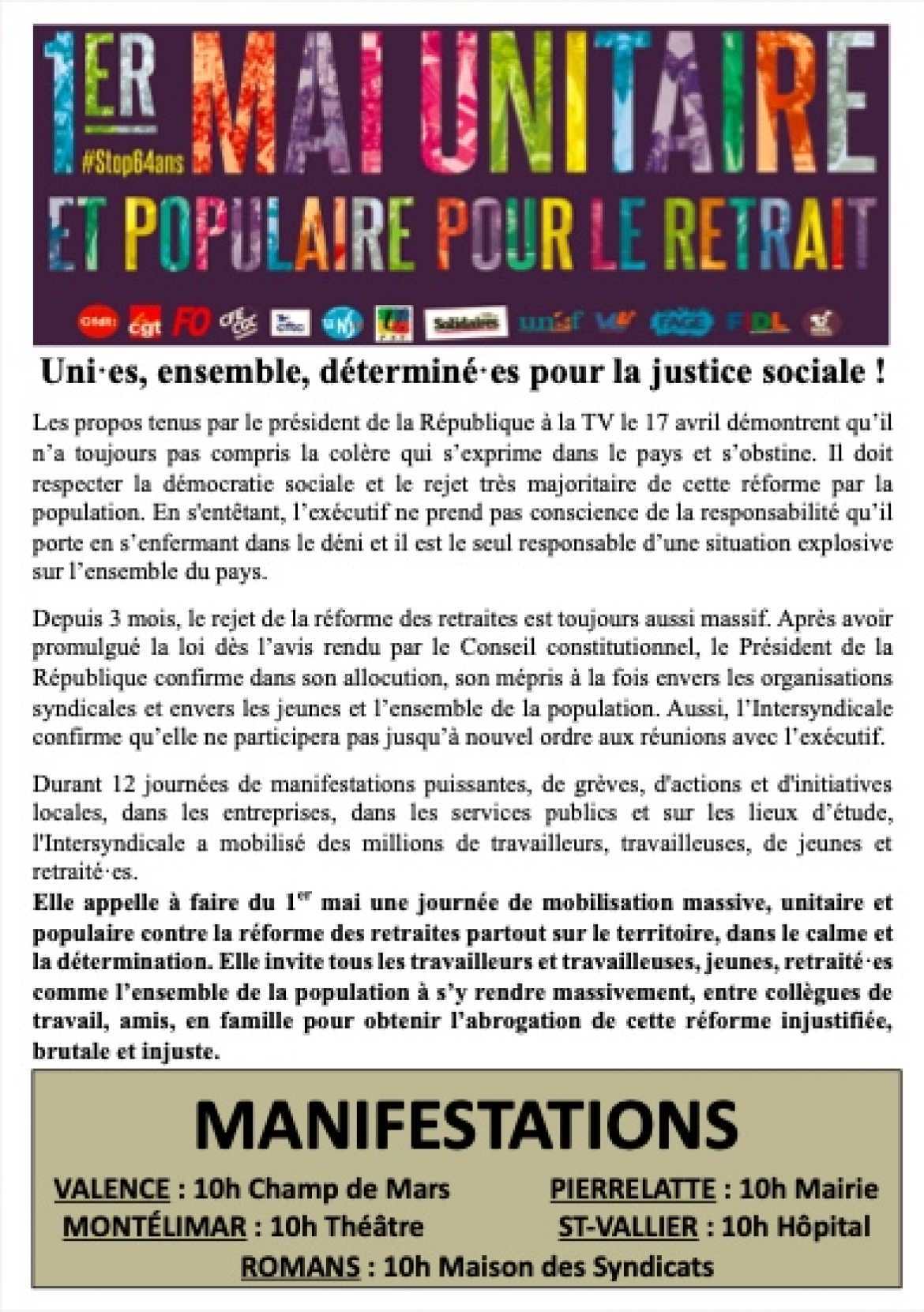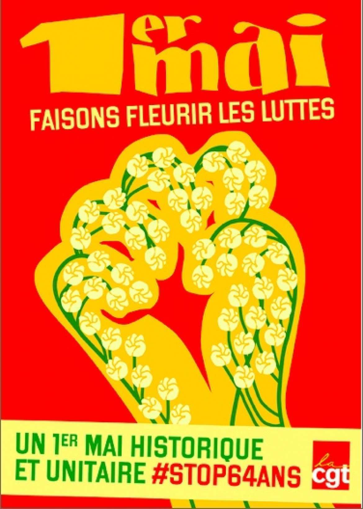 Depuis plus de 3 mois, la mobilisation de millions de grévistes et de manifestant·e·s a mis en minorité le gouvernement et le président Macron. La très grande majorité de la population soutient l’action de l’intersyndicale contre le recul de l’âge de départ à la retraite pour toutes et tous. En s’obstinant, le président de la République et son gouvernement ne prennent pas la mesure des attentes des travailleuses et des travailleurs et ne répondent pas aux enjeux industriels et de développement des services publics. Pire, ils sont responsables de la crise sociale et environnementale qu’ils ne cessent d’aggraver. En participant massivement aux manifestations du 1er Mai, salariés, jeunes, retraités, privés d’emploi, famille, amis, voisins, collègues de travail, nous montrerons notre refus du passage en force de cette réforme qui nous impose un recul social sans précédent. Nous exprimerons notre colère en affirmant que « pour nous, 64 ans c’est toujours non ! ». Avec cette lutte, nous donnerons de l’espoir pour gagner sur les retraites, mais aussi pour augmenter nos salaires et nos pensions.