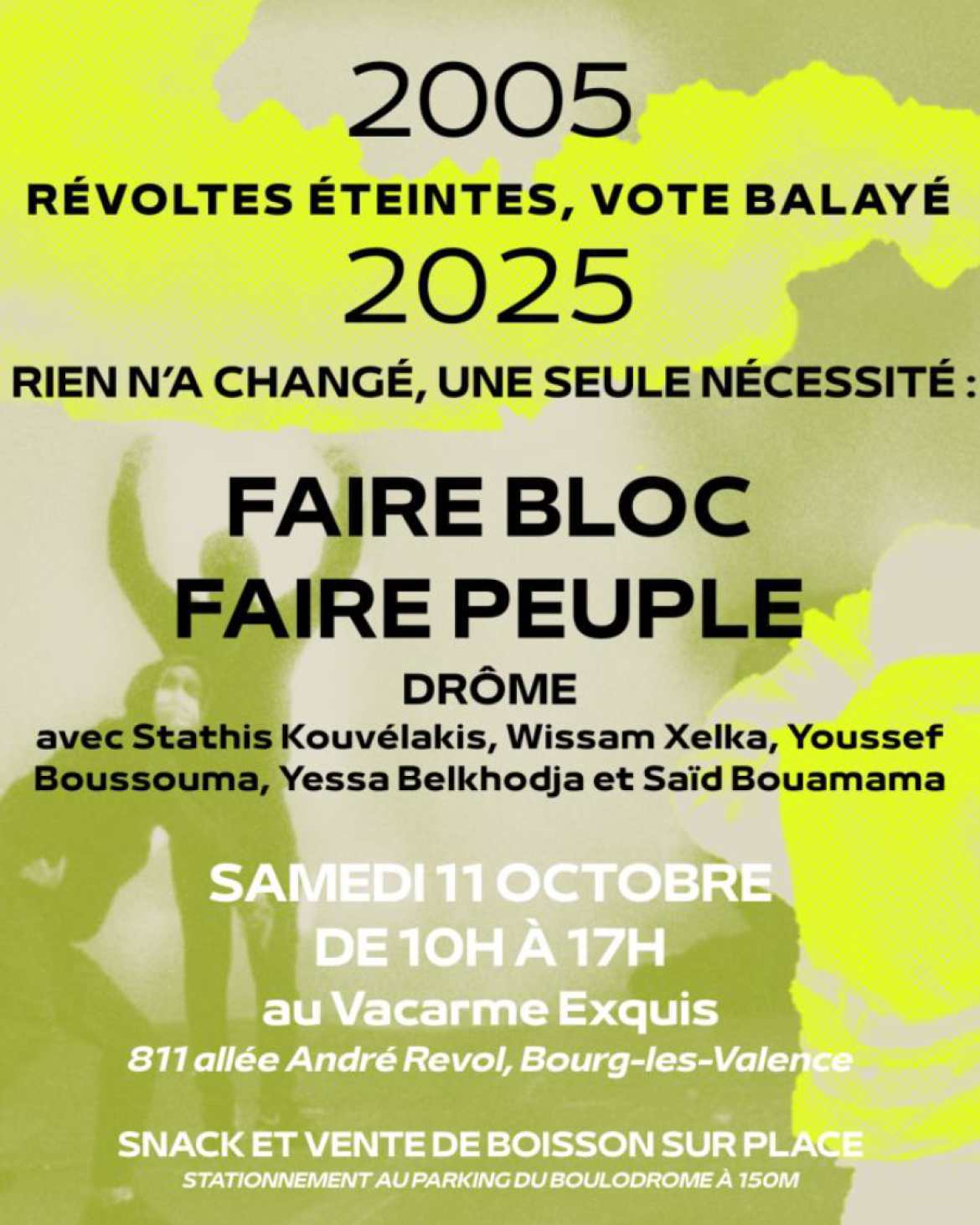 La bataille ne pourra pas être gagnée par une seule force : elle exige l’unité populaire, celle des habitants des quartiers, des travailleurs, des précaires, des Gilets Jaunes, des révoltés de 2005 et de toutes celles et ceux qui refusent le racisme, la guerre et le néolibéralisme."