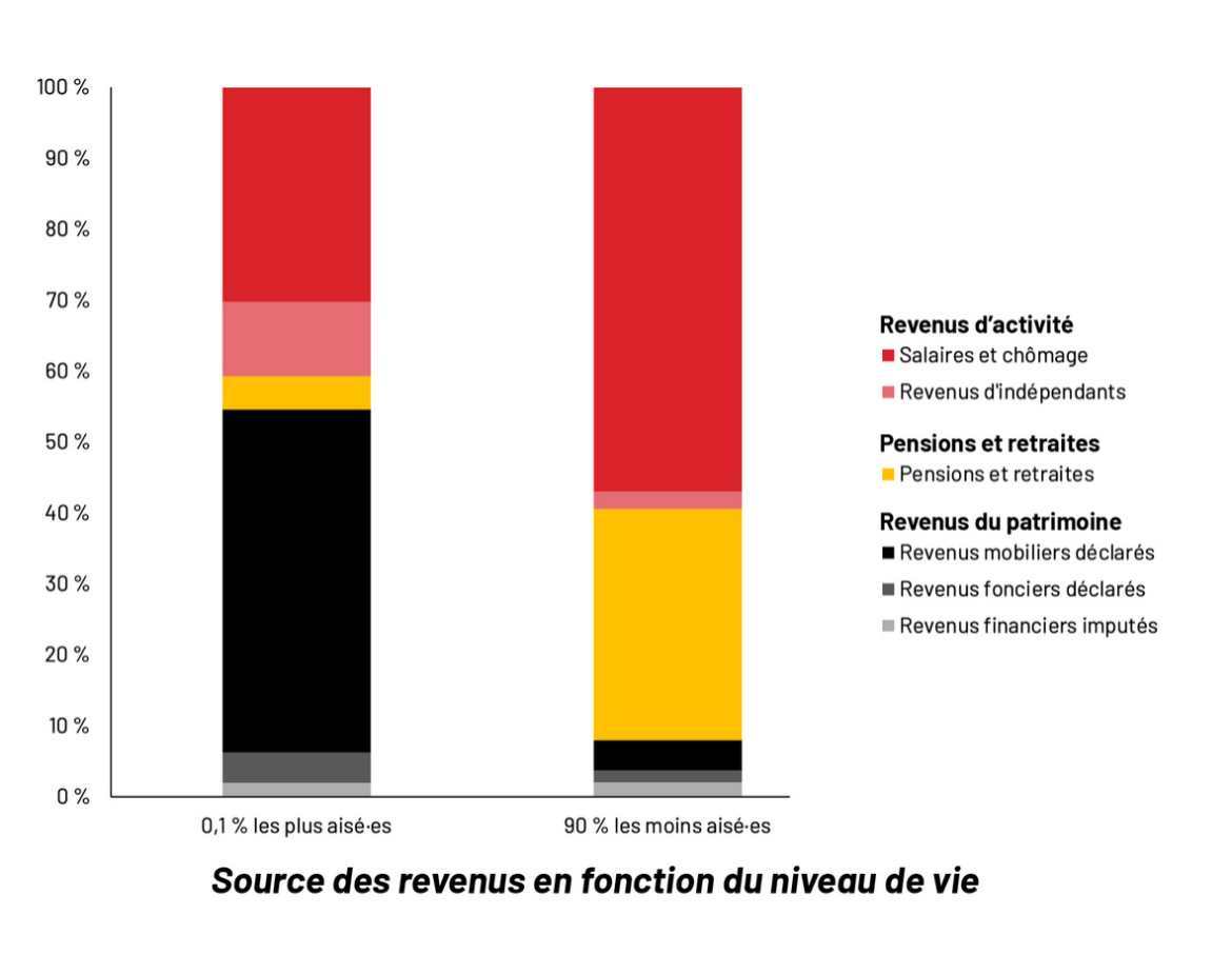 si la majeure partie de la population tire ses revenus du travail (ou des pensions, obtenues à l’issue d’une longue carrière), plus de la moitié de ce que gagnent les 0,1 % les plus riches est issu de leur patrimoine (bien souvent hérité – pour le mérite on repassera) ;