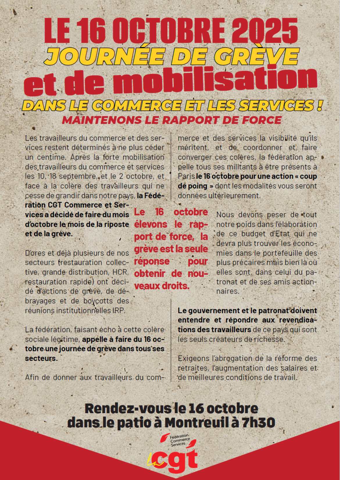 La Fédération des travailleur.se.s du Commerce et des services appelle à continuer les mobilisations des 10, 18 septembre et 2 octobre.