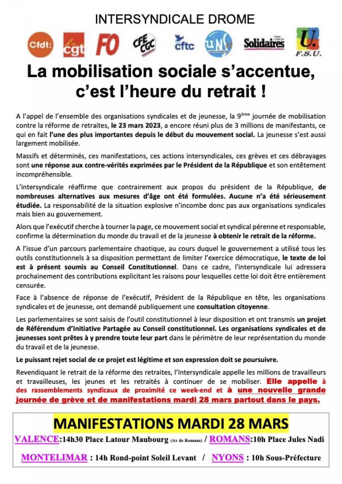 reforme des retraites, greves intersyndicales et interprofessionnelles, manifestations Drome 28 mars 2023 -