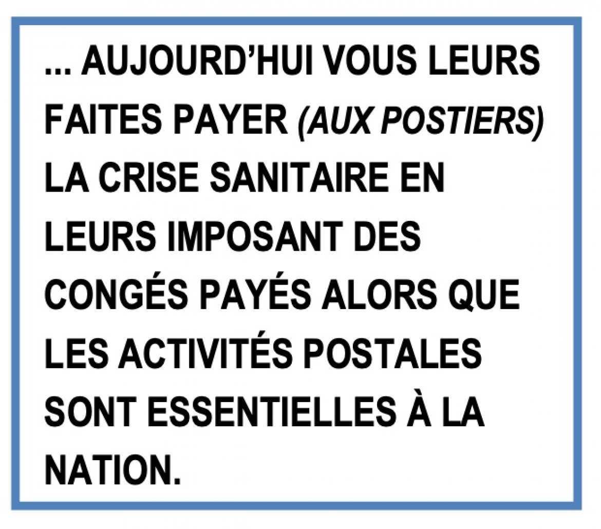 Après les avoirs privés d’intéressement, leur avoir envoyé un signe de mépris très fort dans le cadre des négociations salariales, supprimé des emplois, imposé des restructurations qui détériorent les conditions de travail, aujourd’hui vous leurs faites payer la crise sanitaire en leurs imposant des congés payés alors que les activités postales sont essentielles à la nation.