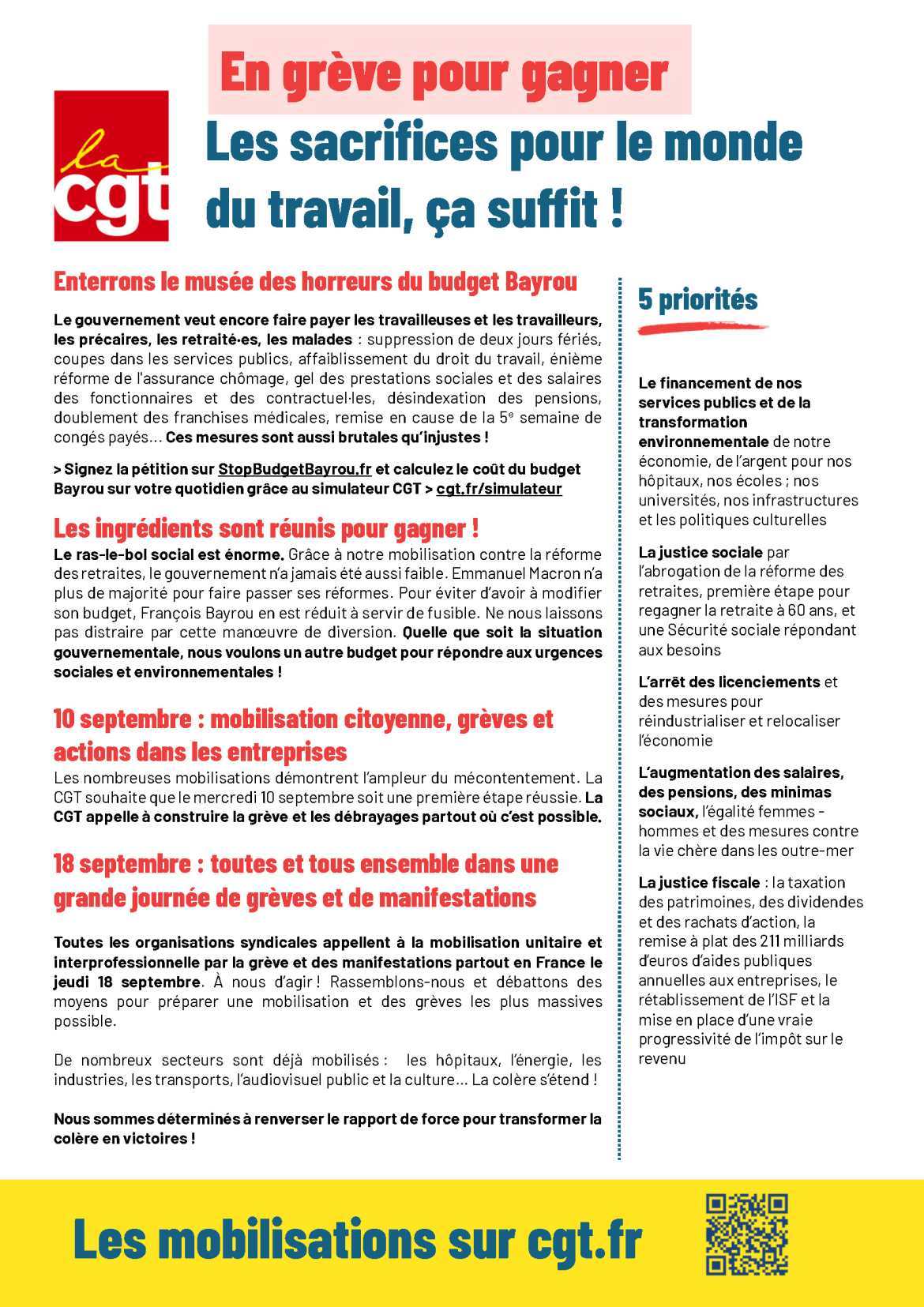 Les nombreuses mobilisations démontrent l’ampleur du mécontentement. La CGT souhaite que le mercredi 10 septembre soit une première étape réussie. La CGT appelle à construire la grève et les débrayages partout où c’est possible.