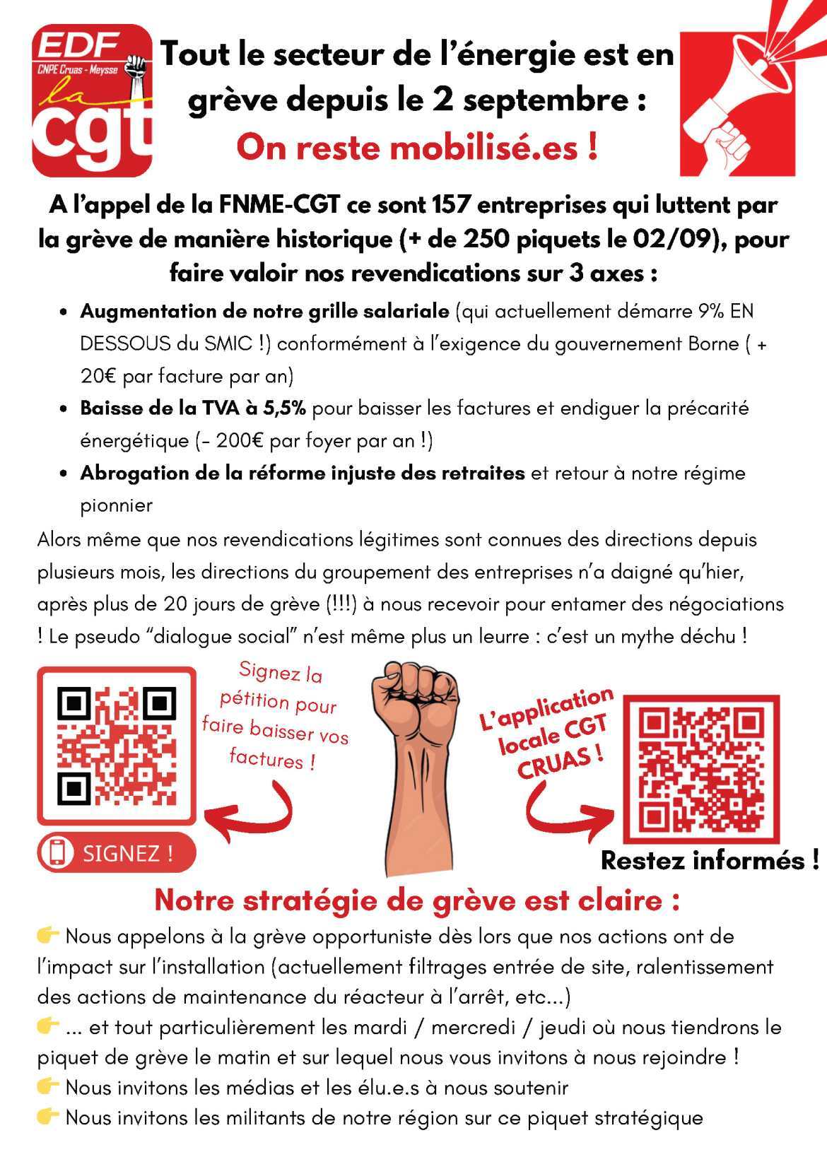 Tout le secteur de l’énergie est en actions et en grève depuis le 2 septembre : elles et ils ont besoin de notre soutien pour grossir les effectifs sur les piquets, savoir que nous sommes ensemble dans la lutte engagée, faire savoir que nous soutenons leurs revendications et notamment la TVA à 5,5% sur les factures d'énergie (n'oubliez pas de signer la pétition) et se relayer.