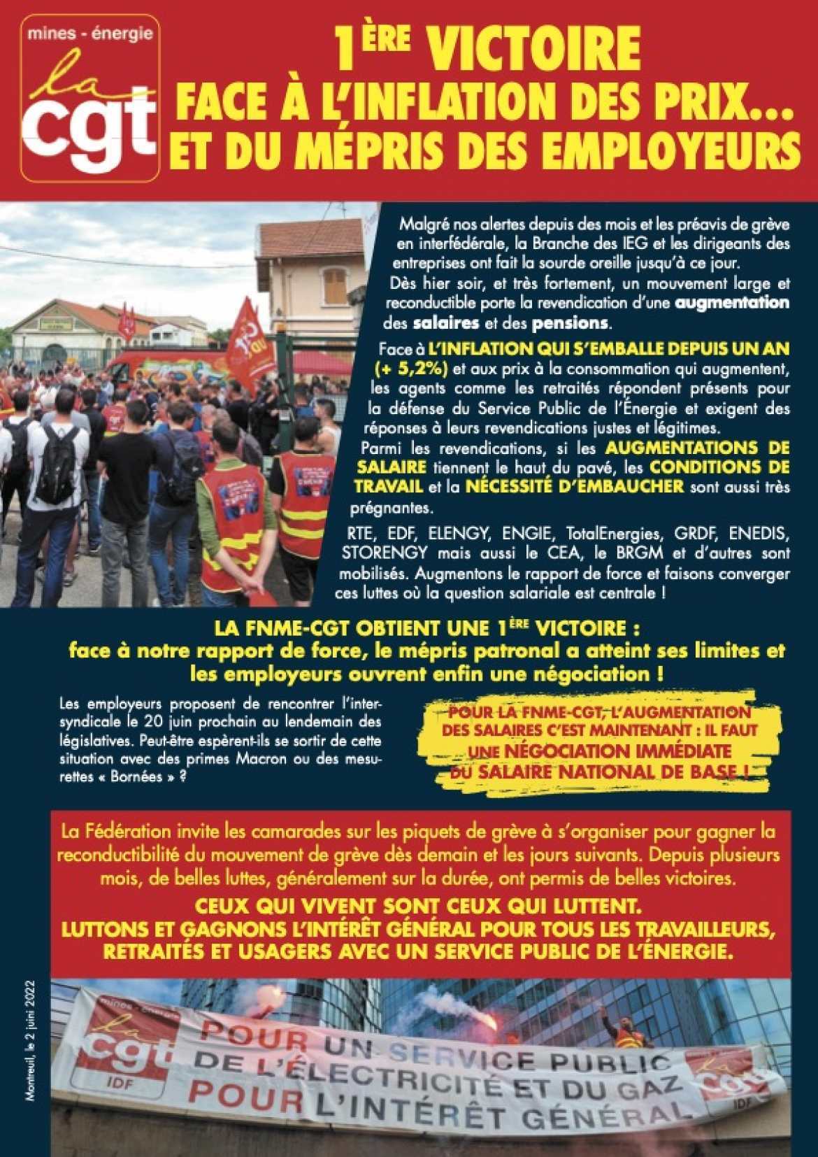 Dès hier soir, et très fortement, un mouvement large et reconductible porte la revendication d’une augmentation des salaires et des pensions.Face à L’INFLATION QUI S’EMBALLE DEPUIS UN AN (+ 5,2%) et aux prix à la consommation qui augmentent, les agents comme les retraités répondent présents pour la défense du Service Public de l’Énergie et exigent des